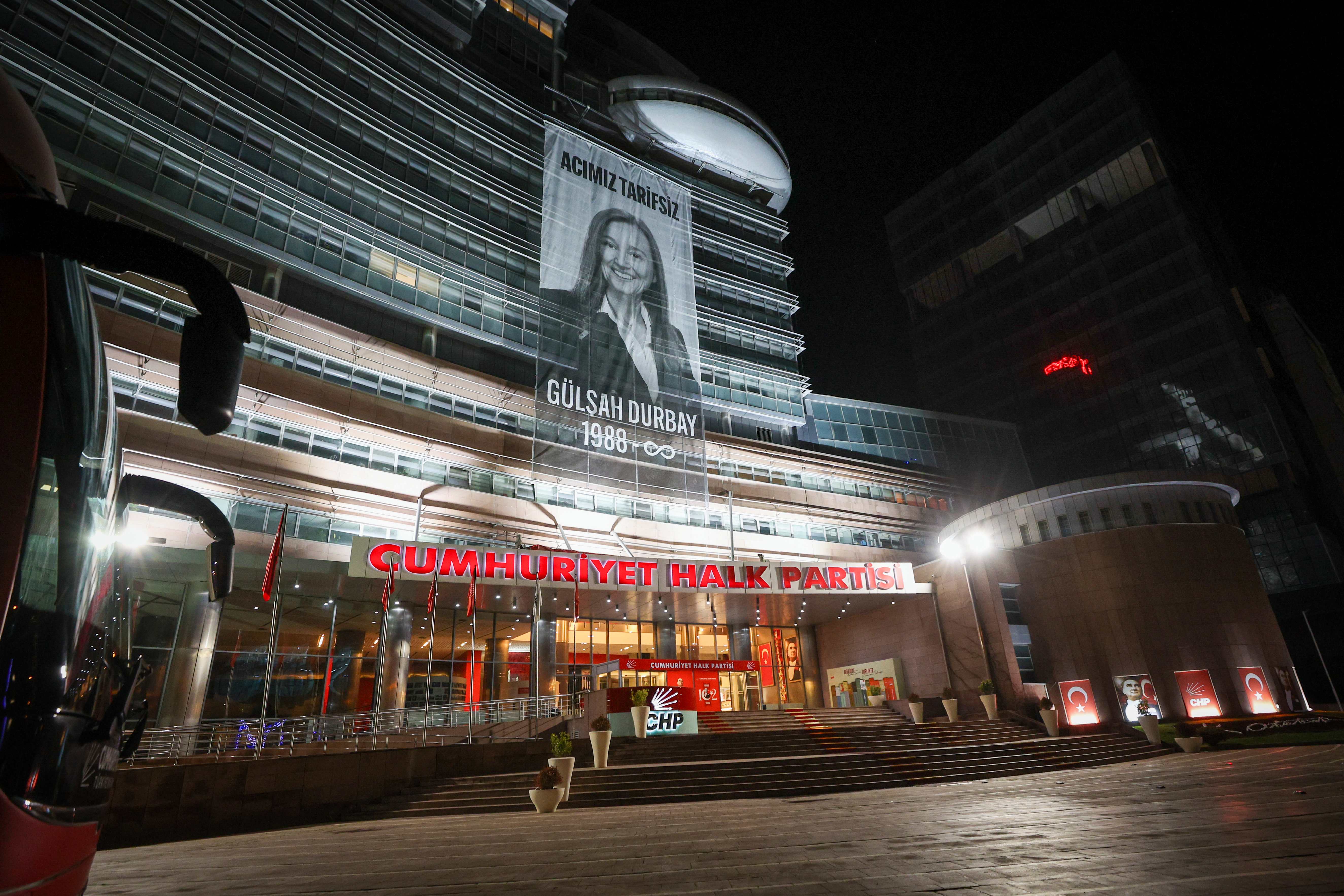 Cumhuriyet Halk Partisi (CHP) Genel Merkezi’ne asılan pankartta, Gülşah Durbay’ın fotoğrafının yanı sıra doğum tarihi ve sonsuzluk işareti yer aldı. Pankartta “Acımız Tarifsiz” ifadeleri kullanıldı.