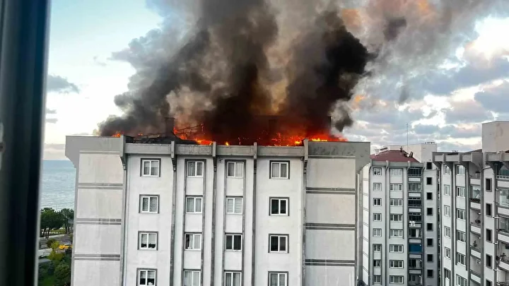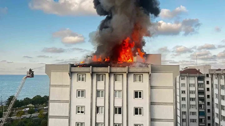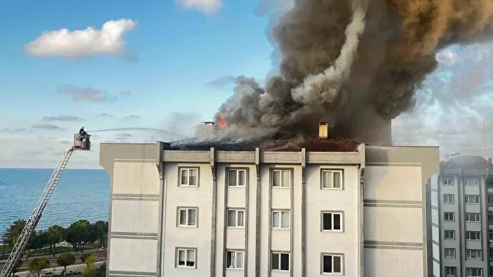 Ordu’da 7 katlı binanın çatısı alev alev yandı