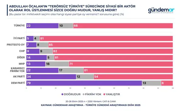 Araştırmada, terör örgütü lideri Abdullah Öcalan’ın süreçte siyasi bir aktör olarak rol üstlenmesini doğru bulanların oranı da yüzde 22 olurken yanlış bulanların oranı yüzde 68’e kadar çıktı.