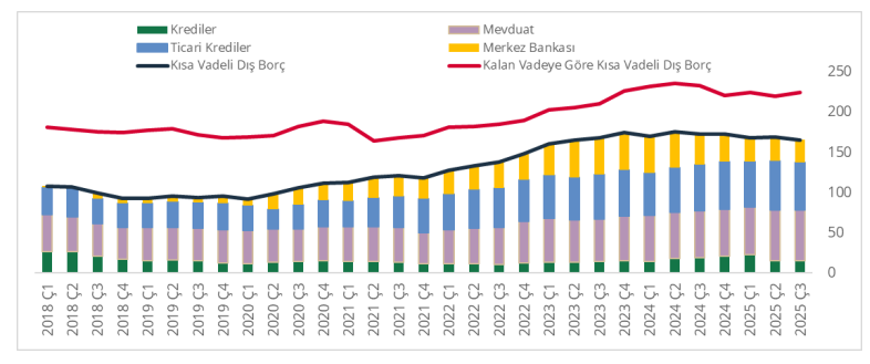 Son dakika… Türkiye’nin Kısa Vadeli Dış Borç (KVDB) stoku, bir önceki çeyreğe göre yüzde 2,1 oranında azalarak 2025 Eylül ayı itibarıyla 165,8 milyar ABD doları oldu.