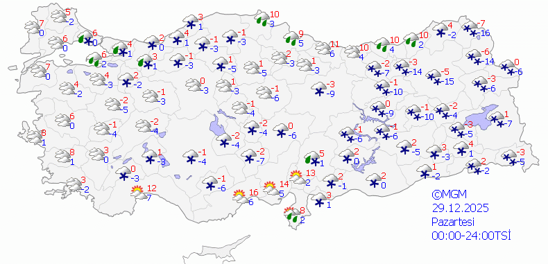 Meteoroloji Genel Müdürlüğü, 26 Aralık 2025 ile 2 Ocak 2026 tarihleri arasında bölgeye bağlı il merkezlerinde en düşük hava sıcaklıklarının eksi değerlere kadar düşebileceğini belirterek, yayımlanacak tahmin ve meteorolojik erken uyarıların yakından takip edilmesinin önem taşıdığını vurguladı.